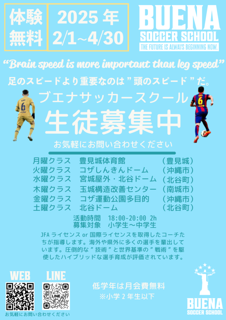 BUENAスクールでは、JFAライセンスor国際ライセンスを取得したコーチたちが指導します。海外や県外に多くの選手を輩出しています。圧倒的な”技術”と世界基準の”戦術”を駆使したハイブリッドな選手育成が評価されています